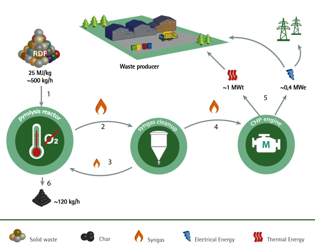 - Part of the produced syngas is used to power the pyrolysis burners making the process autothermal.