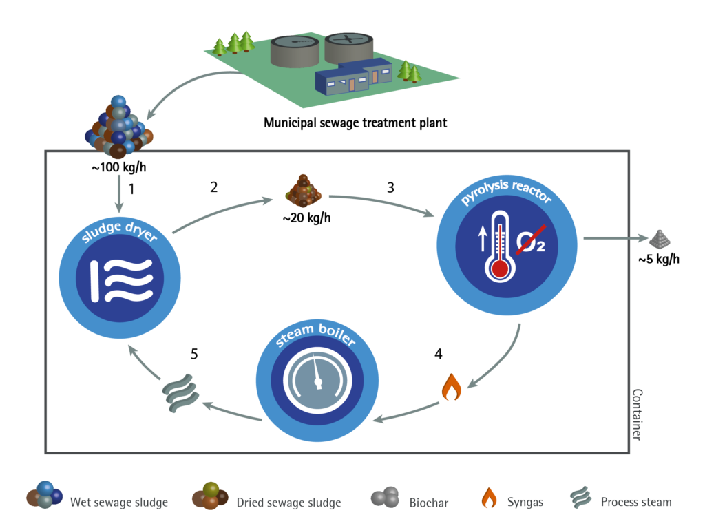 - Dry sewage sludge is subjected to a continuous process of high temperature pyrolysis without oxygen. Pyrolysis temperature range reaches from 800°C to 1000°C.